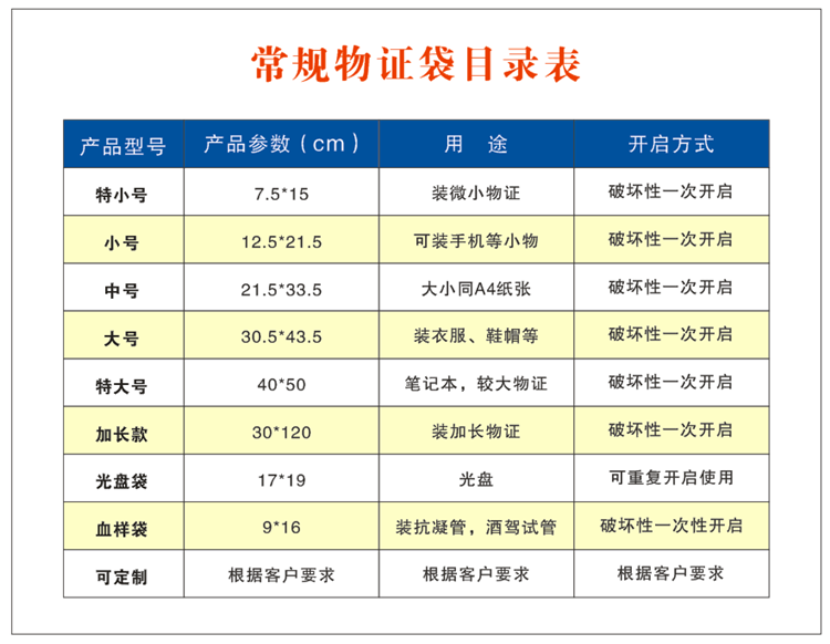物证袋用透明塑料膜制成。表面白色印刷区域印有表格,可使用油性、中性笔和油性记号笔或者圆珠笔在其上书写。塑料物证袋可盛放潮湿和浸油的物证。塑料的透明度好,很容易的从外面观察物证。物证袋开口处有密封胶带,将物证放入袋中后,用密封胶带将开口密封,密封后的物证袋不能无损开启。