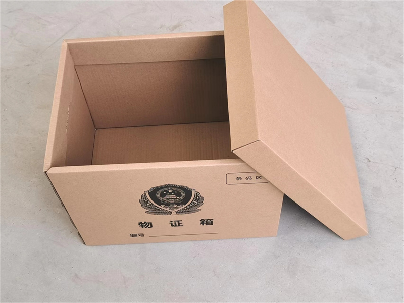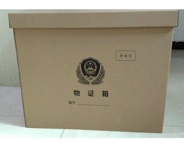 物证箱采用高强度高密度超硬五层瓦楞纸、整体式做成,带箱盖,表面光滑,可方便粘贴物证标签,箱体两侧配有手扣,可以承受10 kg以上的重量,强度不低于塑料周转箱,可反复使用。