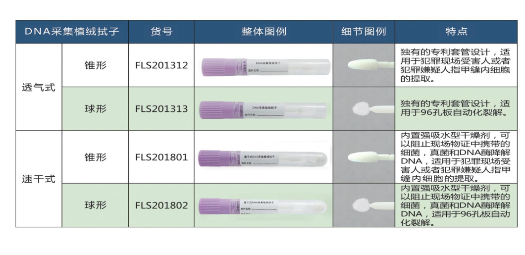 本公司生产的DNA提取植绒拭子采用尼龙纤维植绒技术制作而成,前端涂有以垂直方式固定的尼龙短纤维,使得整个采集拭子采集区域内部无吸收孔,DNA细胞不会分散滞留纤维之中,有利于更快更有效的洗脱。相对于传统植绒包装形式,速干式生物物证植绒拭子减少了生物样本DNA在运输过程中的降解及霉变,同时拭子放置于管体内,防止检材因包装粘附而受到污染,有利于生物物证的长期保存;