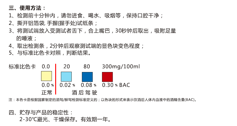 将能与酒精起化学反应的化合物固定到检测条上,选择合适的显色剂,产生颜色变化,其变色程度(快慢、深浅)直接取决待测样品中酒精的浓度,2分钟后通过与所提供的标准比色卡进行比较,判断结果