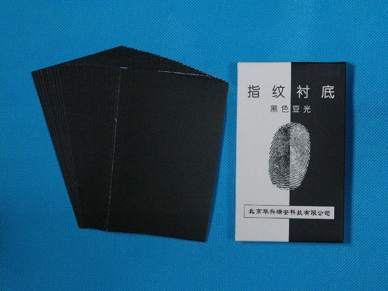 黑色亚光指纹衬底 黑色亚光指纹衬底 价格:20.00元/盒产品用途:用粉末显现的指纹,要用指纹胶带粘取,再将胶带粘附在指纹衬底上。适用于浅色粉末显现的指纹。亚光衬底,拍照时不会反光形成亮斑,产品通过相关部门的检测。产品结构:厚度0.35mm的硬纸片,一面黑色,一面白色,黑色面复合亚光塑料膜。黑色面用于指纹衬底,白色面用于书写物证信息。产品规格:70x127mm/张,30张/盒正面复合亚光塑料膜,用于指纹衬底背面是纸质材料,用于书写物证信息