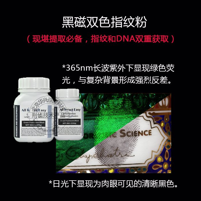 AIE双色磁性指纹粉(欧洲) 双色磁性指纹粉(欧洲)500g/瓶(3000.00元) & 1000g/瓶(5500.00元) 产品产地:欧洲 产品应用范围:半渗透性和非渗透性的潜指纹显现。 产品特点:操作简便、显现效果好 产品介绍: 适用于非渗透性及半渗透性的多色复杂表面,如喷绘纸张、皮革、陶瓷、玻璃、 塑料板上的汗潜指纹的显现。 在日光下,显现为肉眼可见的清晰黑色。 在 365nm 长波紫外下激发显现为绿色荧光,与复杂背景形成了强烈的反差。