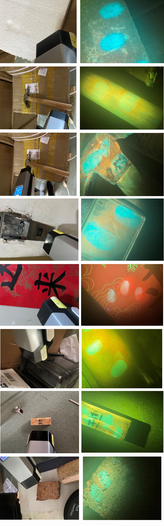 手持式可视化生物痕迹发现仪用于生物痕迹的无损发现。该产品利用我公司研发的氨基酸多靶点靶向标记荧光试剂对氨基酸进行标记,利用微孔雾化技术形成直径1-4微米的荧光颗粒,经过快速熏显,使荧光试剂均匀附着在检材表面,氨基酸多靶点靶向标记荧光试剂与生物痕迹的氨基酸进行吸附形成稳定的物质。该物质可激发出强烈荧光从而进行提取,产品通过了相关部门的检测。