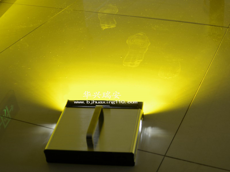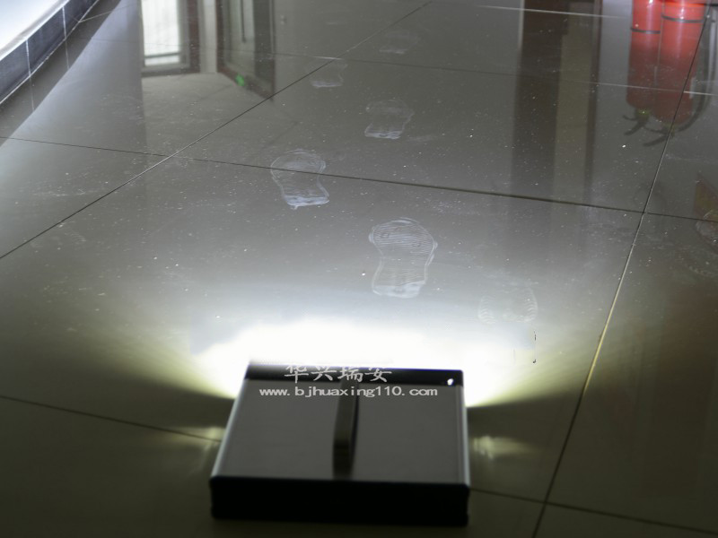 足迹灯输出高亮度扁平光,以贴近地面的角度照射,光滑地面对入射光进行镜反射,灰尘对入射光进行漫反射。避开地面的镜反射方向观察地面,就可以看到暗色的地面与明亮的灰尘足迹之间形成较大的反差。