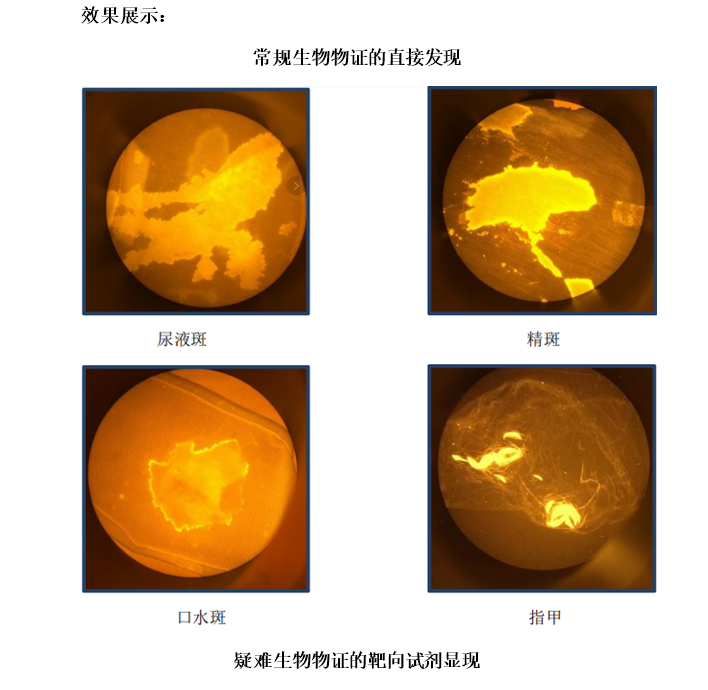 1、常规生物物证直接荧光显现(如:精斑、唾液斑、指甲、牙齿、骨骼碎片及涂料墙上指纹等);